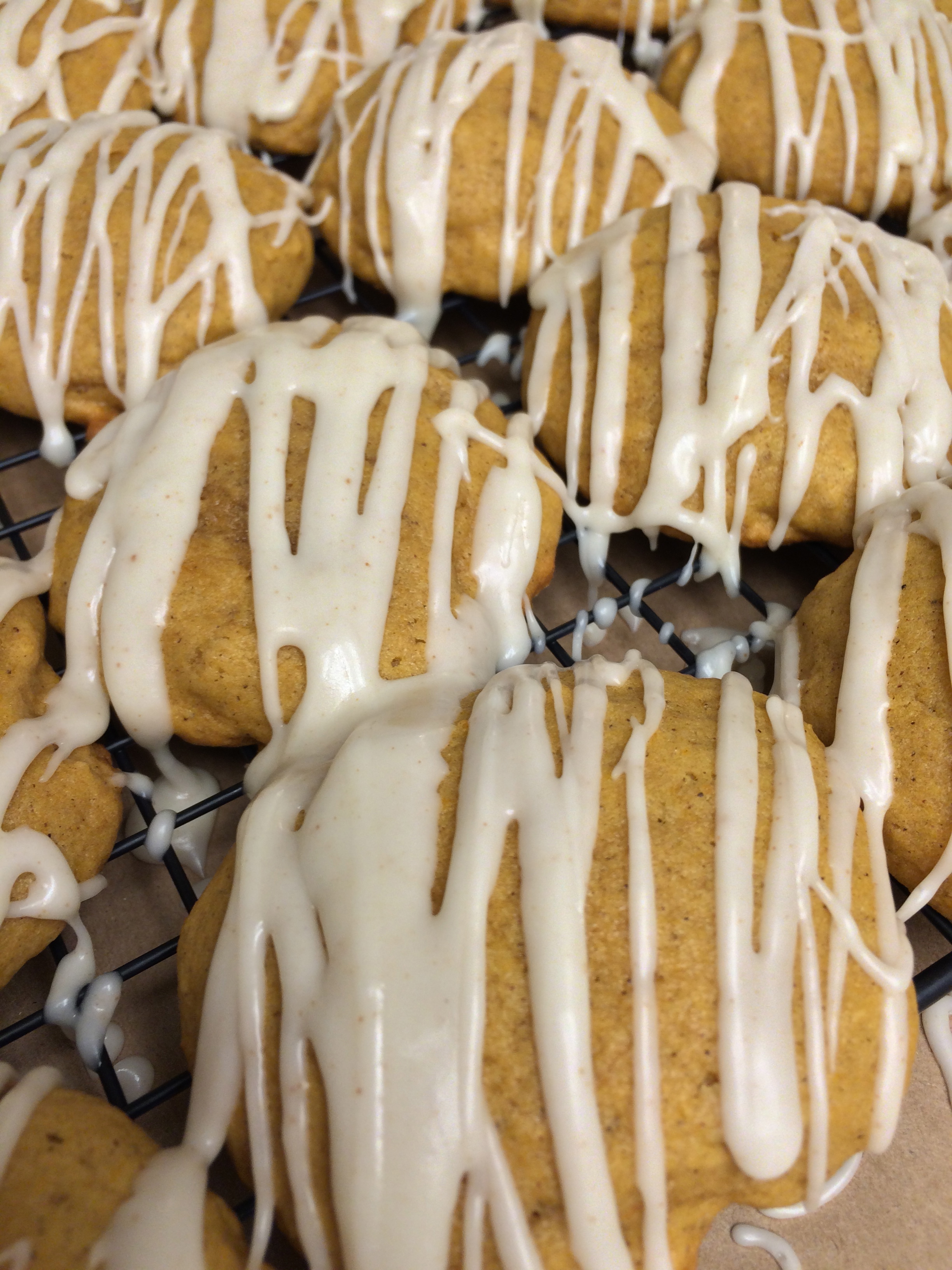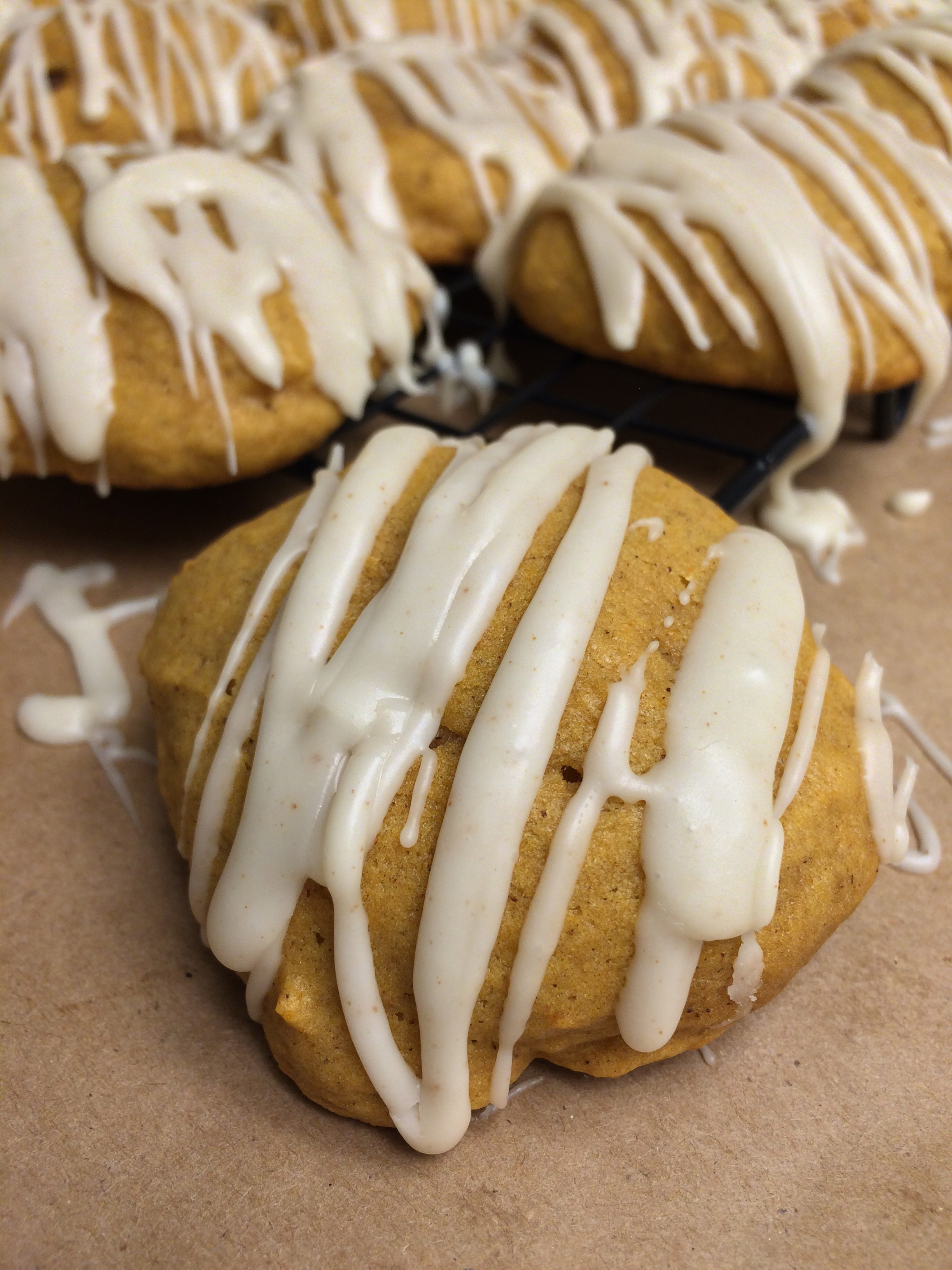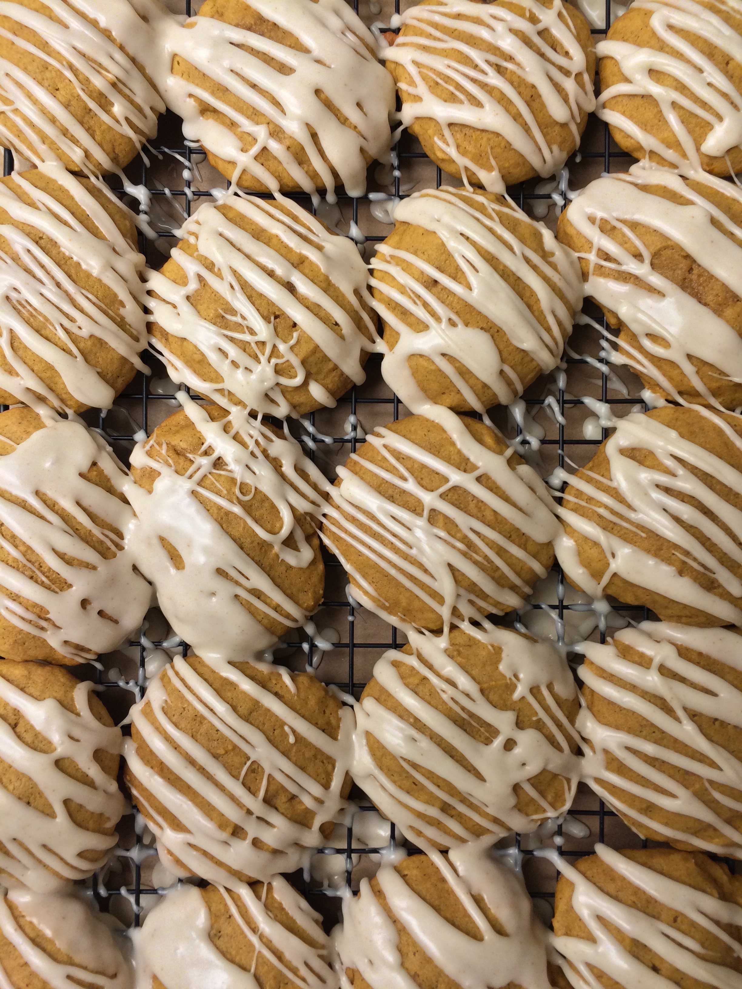 Soft and moist pumpkin cookies with drizzled brown butter frosting. Makes 24-28 cookies.